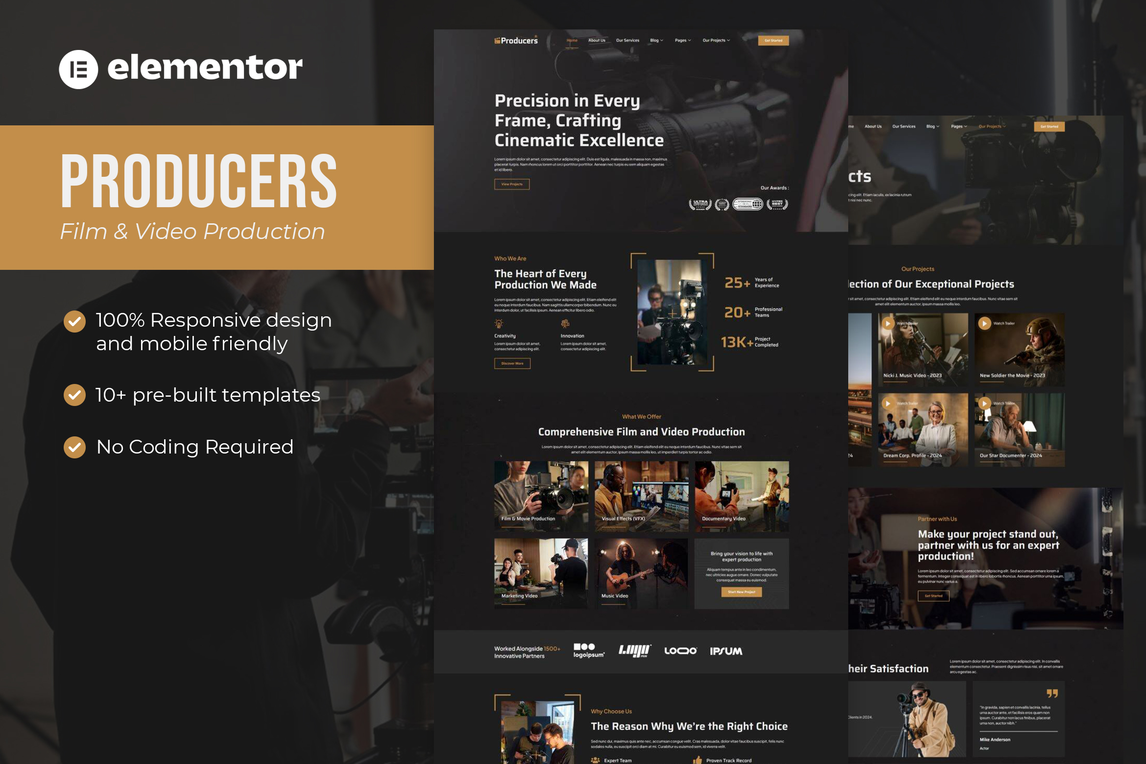Producers is modern and elegant Elementor Template Kit for Film & Video Production Websites. You can also use this creative template kit for any kind of services related to Video Production Website such as movie production, theatre, documenter video production, music video production, ads video production, and all kinds of video production websites.